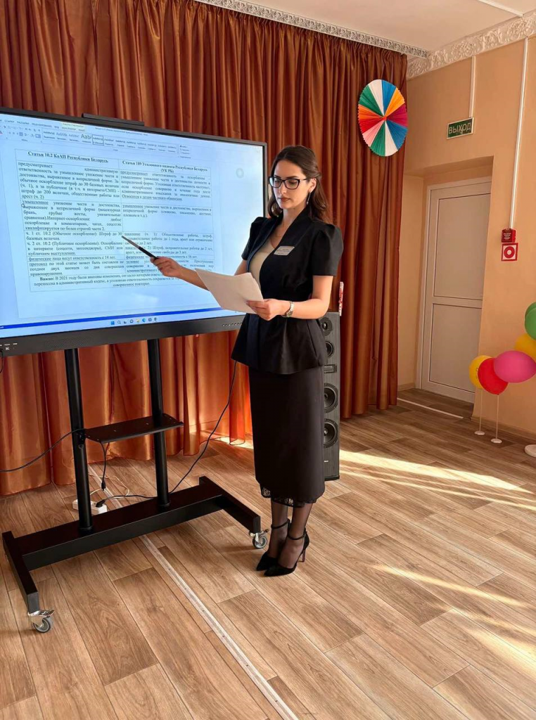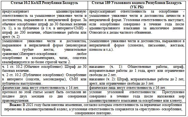 Цель мероприятия — формирование у воспитанников навыков этичного и доброжелательного взаимодействия, развитие коммуникативных способностей, изучение правил этикета, повышение знаний об ответственности за совершение противоправного деяния. В процессе занятия совместно с воспитанниками составлена таблица соотношений статьи 10.2 Кодекса Республики Беларусь об административных правонарушений «Оскорбление» и статьи 189 Уголовного Кодекса Республики Беларусь «Оскорбление» , где выделили понятие, предмет , основания и возраст наступления ответственности.
